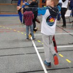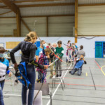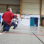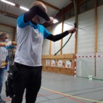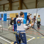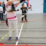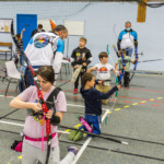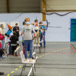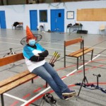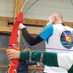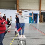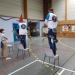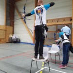 - Plus haut que d’habitude, il fallait viser légèrement en contrebas tout en gérant un équilibre différent. Chaque équipe recueille un gage : à la « demande générale » du public, retour du tir en équilibre sur un pied (si, si, les tireurs étaient « heureux »)