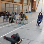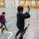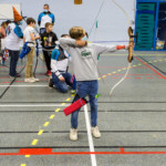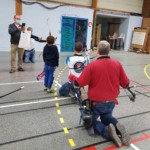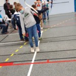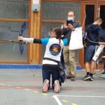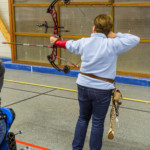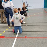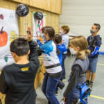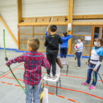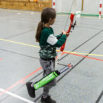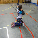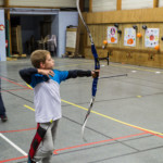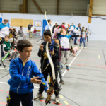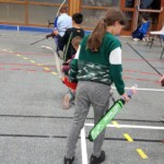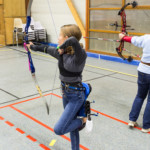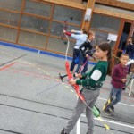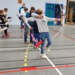 en équilibre sur zéro piedà genoux - Plus près du sol, la plupart des arcs doivent être penchés pour être utilisés convenablement : pas si évident que ça en a l’air ! Chaque équipe recueille un gage : les tireurs devront d’abord monter sur une chaise