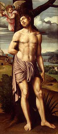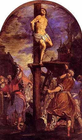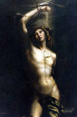 - ou encore, il aurait été lié à un arbre (ou une colonne) et ses archers, ceux qu’il commandait, lui tirèrent dessus mais, en raison de l’affection qu’ils avaient pour lui, évitèrent de lui toucher un organe vital.